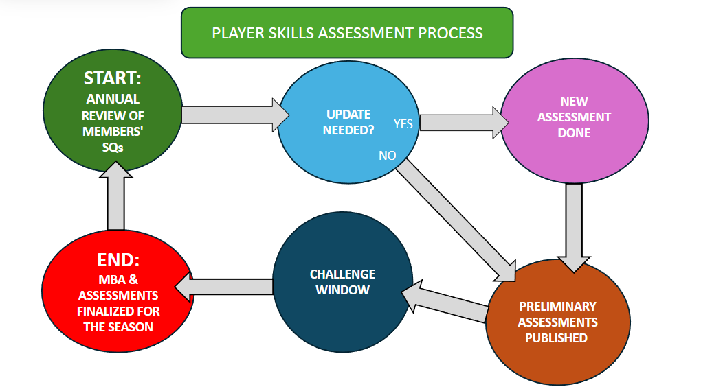 In 2025, we come to the end of a multi-year process to refine the way we do member skills assessments. We continue to use the iPride Skills Ratings Questions (SQs) for benchmarking but have a more unified approach to maximize accuracy, safety, and fairness in our divisional play. Before this update, player assessments were done by each team with limited oversight, but the results were often inconsistent and sometimes inaccurate. We believe one of the most important ways to keep things accurate is to avoid trying to factor in a player’s ‘intangibles’ or personal value. The key is to answer the questions clearly and objectively—without emotion or bias—to get the most accurate results.